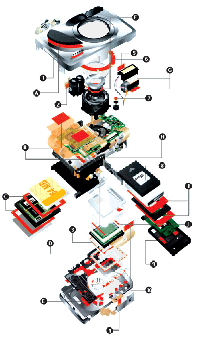 A.橡胶件的固定B.PCB的保护C.闪存卡D.LCD缓冲垫的固定E.按钮及硬质材料的固定F.镜盖的固定G.闪光灯电池/缓冲垫的固定H.反光模的固定I.电池板的固定J.LCD模块的固定