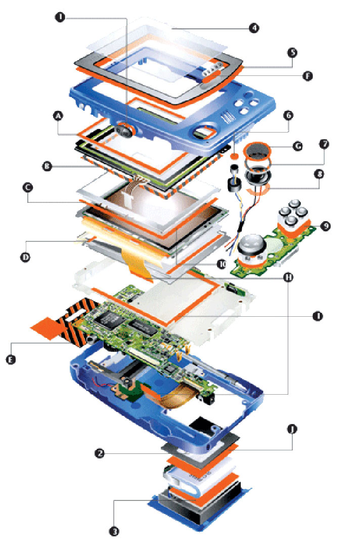 A.触摸屏垫圈B.触摸屏固定C.LCD框架的固定D.背光板E.端口绝缘保护F.标牌定G.话筒防尘网H.FPCB固定I.LCD模块固定J.电池仓固定